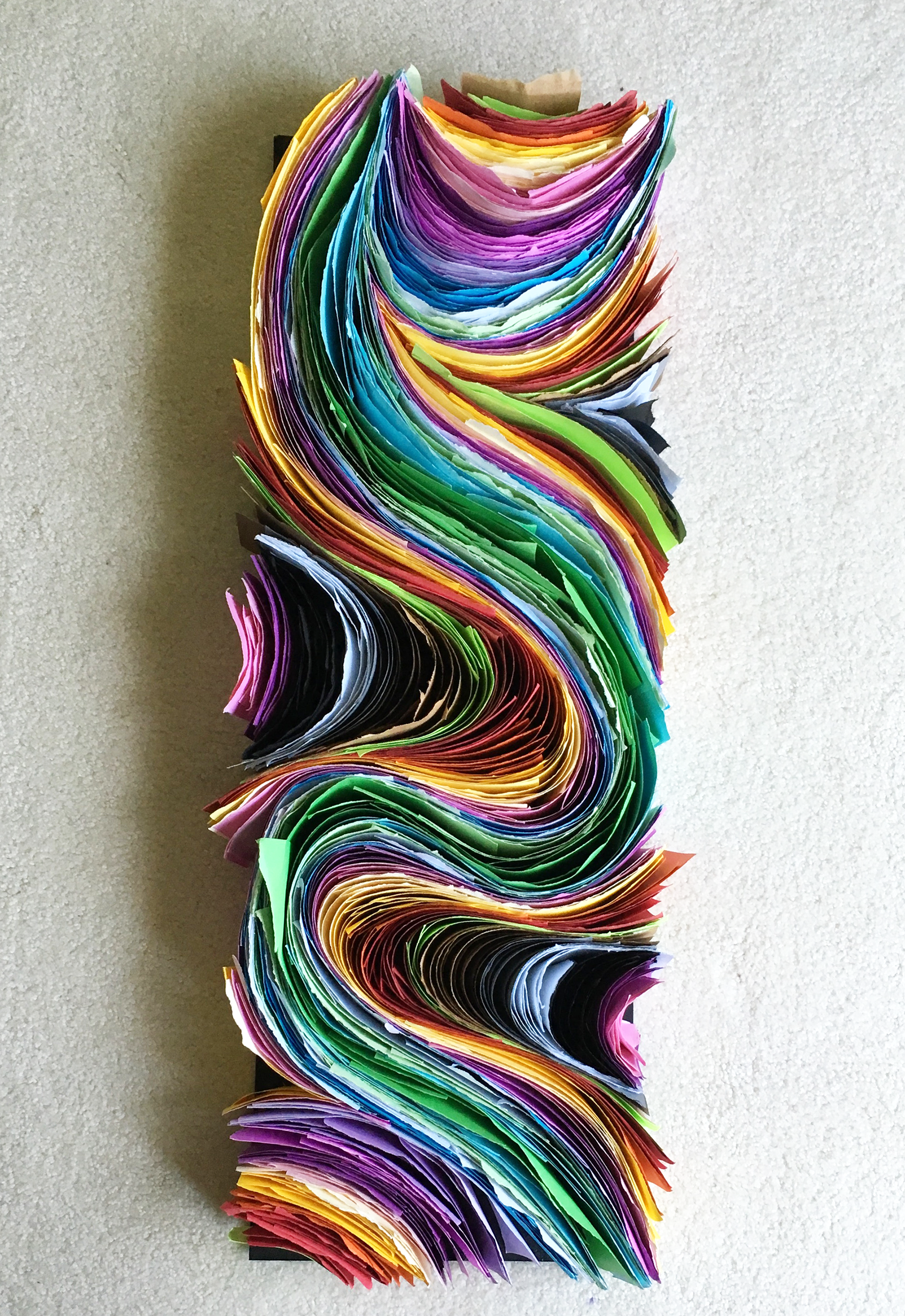 A paper sculpture inspired by the work of the artist Jen Stark, who works mostly with paper. It is created in a way to mimic the curves of Arabic calligraphy. Materials used -Colored card stock. -Glue. -Matte board. -Wood and spray paint. -Light bulb.
